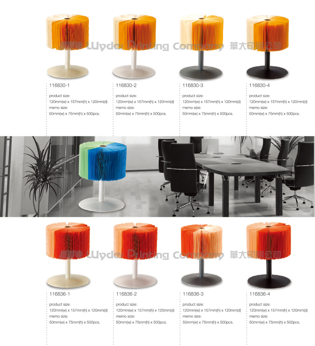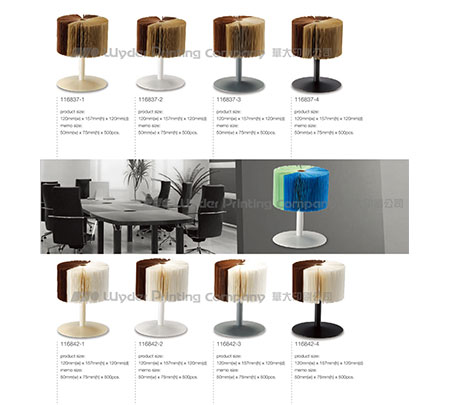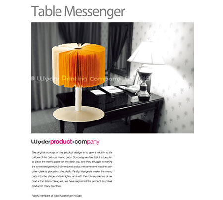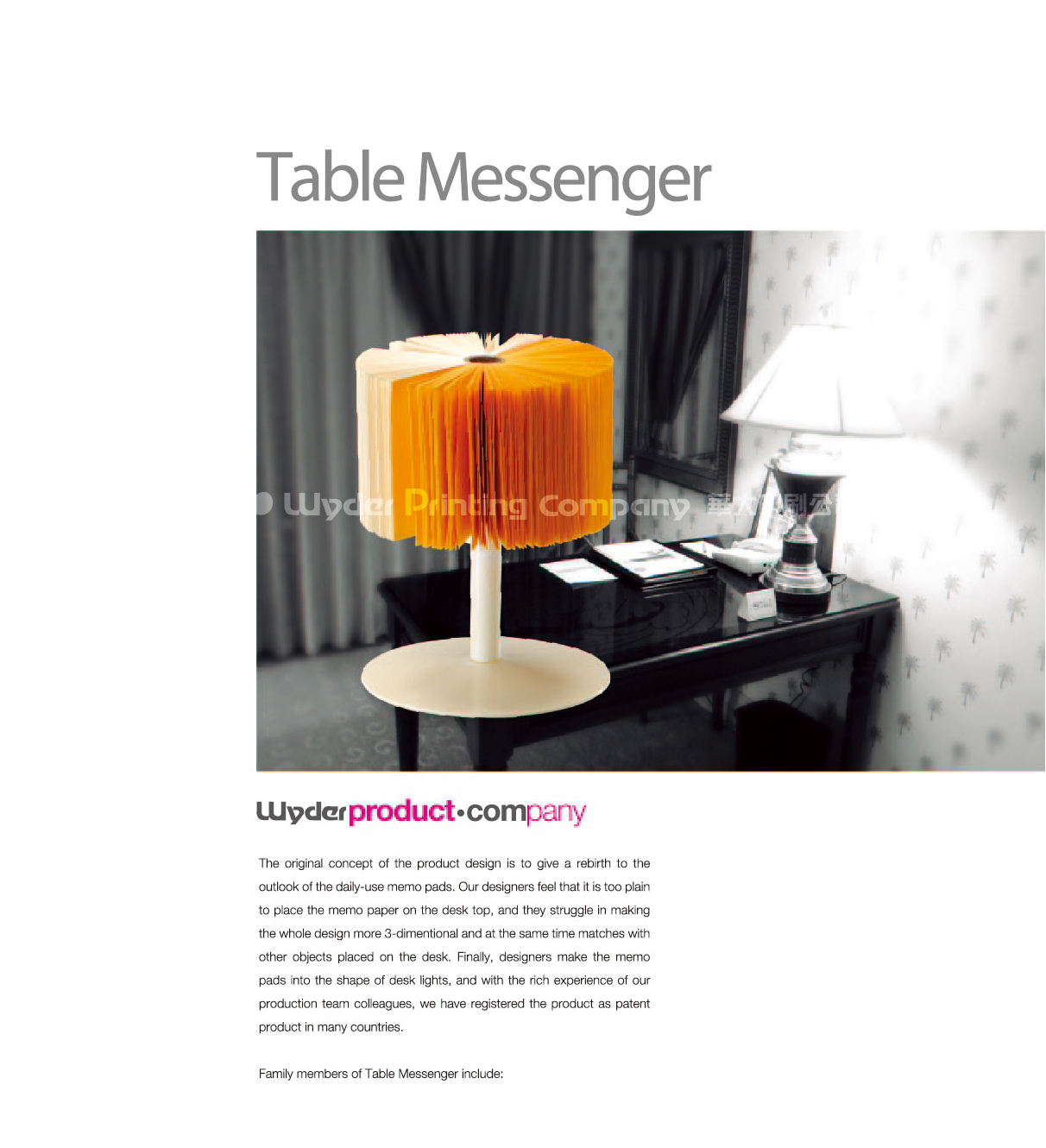 The original concept of the product design is to give a rebirth to the outlook of the daily-use memo pads. Our designers feel that it is too plain to place the memo paper on the desk top, and they struggle in making the whole design more 3-dimentional and at the same time matches with other objects placed on the desk. Finally, designers make the memo pads into the shape of desk lights, and with the rich experience of our production team colleagues, we have registered the product as patent product in many countries.