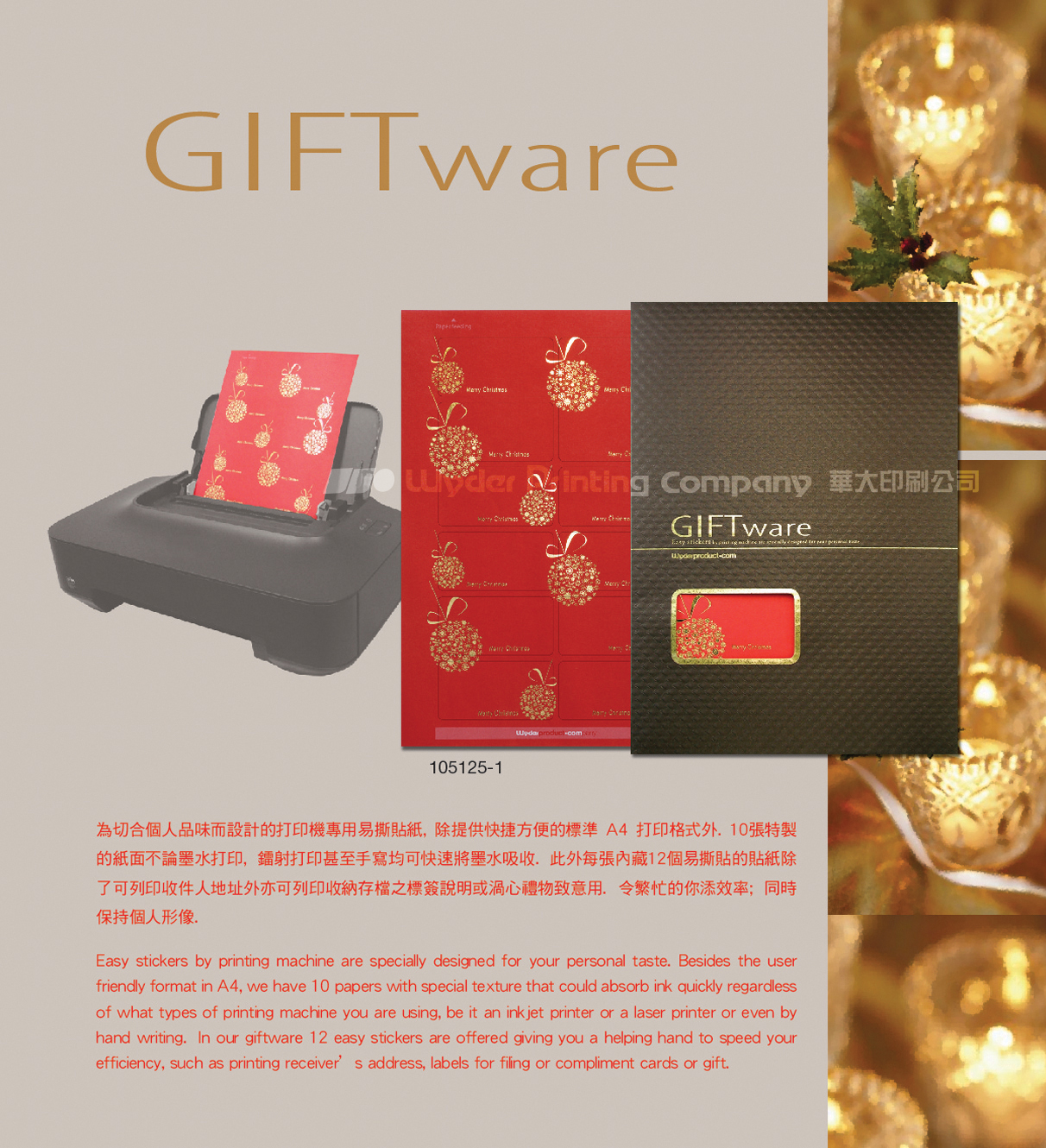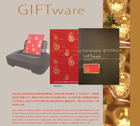 Easy stickers by printing machine are specially designed for your personal taste. Besides the user friendly format in A4, we have 10 papers with special texture that could absorb ink quickly regardless of what types of printing machine you are using, be it an inkjet printer or a laser printer or even by hand writing. In our giftware 12 easy stickers are offered giving you a helping hand to speed your efficiency, such as printing receiver’s address, labels for filing or compliment cards or gift.